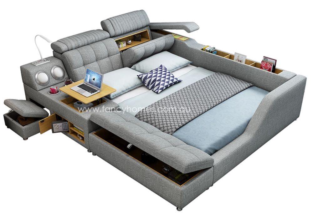 Introducing the Abby Multi-Functional Fabric Bed Frame, our latest innovation in bed design. This all-in-one masterpiece offers abundant storage solutions, including a spacious ottoman, a storage headboard, and convenient armrests. Additional integrated features include a digital safe, a lifting table, a USB charger, Bluetooth speaker dock, and optional lighting, making it a versatile and stylish addition to any bedroom.Product Details: