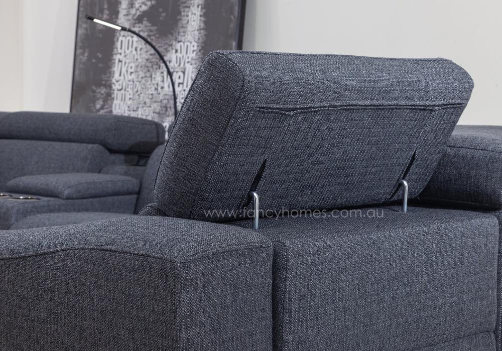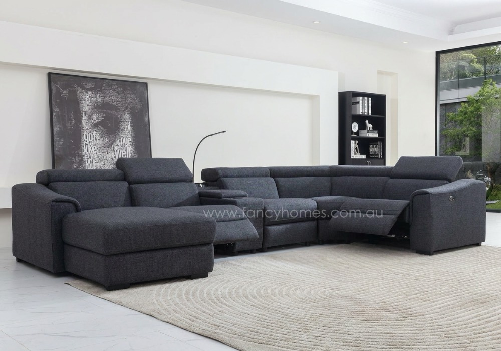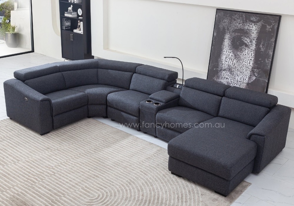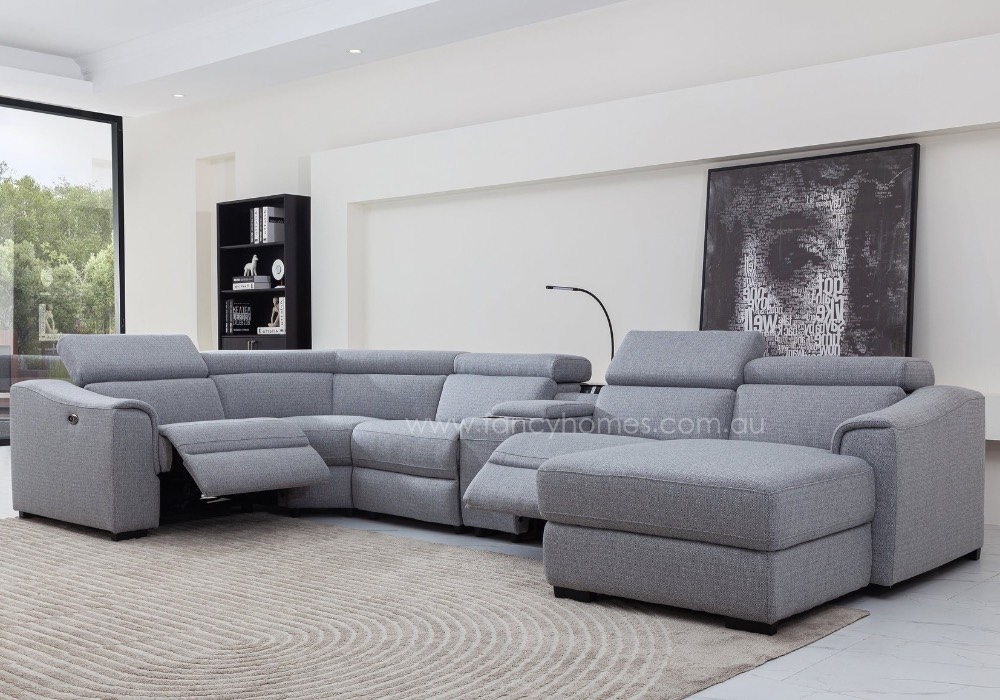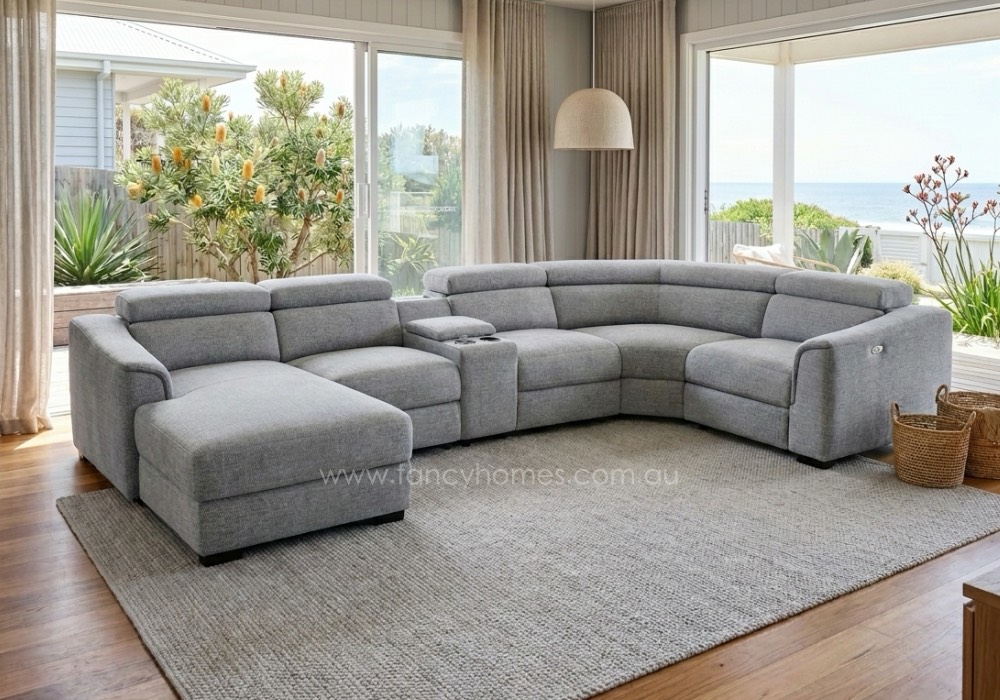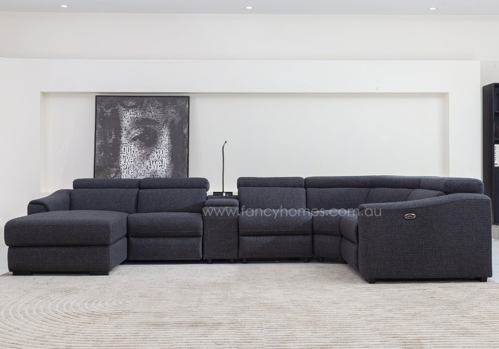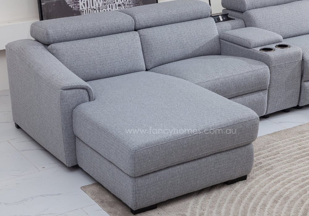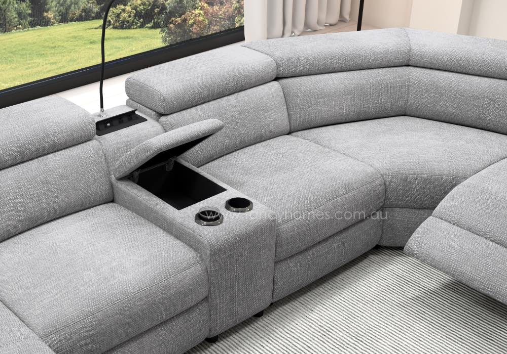 Designed for modern family living, the Castor modular sectional effortlessly combines contemporary elegance with a warm, cozy atmosphere. Upholstered in premium, high-performance fabric, this spacious corner lounge is designed to withstand everyday life while remaining exceptionally soft and breathable. Available in sophisticated dark grey or light grey, it can also be fully customised in a wide variety of premium materials and designer colours to perfectly match your interior. The Castor is engineered for ultimate relaxation and smart home convenience. It features whisper-quiet power recliners, adjustable headrests, and a sophisticated smart console table. This integrated console is equipped with a lift-up storage compartment, built-in cup holders, a sleek LED reading light, and a charging station boasting USB ports and AC power outlets.The standard Castor fabric sofa with chaise includes: