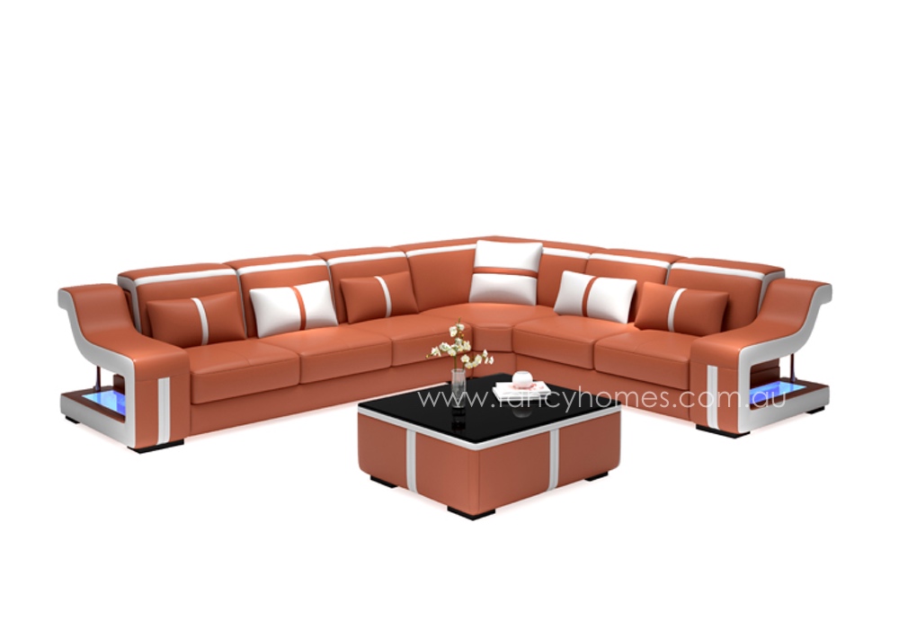 Gabriel-B is Fancy Homes new contemporary L-shaped corner leather sofa. Wrapped with the luxurious leather, the high-density foams inside the seating and back areas maintain the unique shape of this lounge set while providing long-lasting quality. LED lightings under the armrests not only add visual interest but can also be used as night-lights. The open-shelf displays on both sides of the lounge add extra features for your living room. Sturdy yet comfortable seats and the adjustable headrests made this L-shaped corner lounge a unique addition to your home. To view more configurations of this design, please click here.The standard gabriel-b corner leather sofa includes: