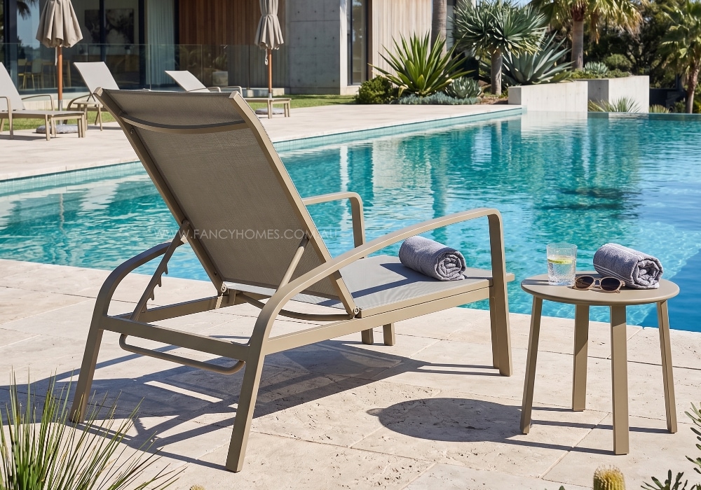 Bring resort-style luxury to your poolside, patio, or garden with the Higet Extendable Sun Lounge. Engineered for both ultimate comfort and space-saving practicality, this innovative sunbed features a hidden retractable footrest that extends up to 60cm when you want to fully stretch out, and slides back seamlessly when not in use. The sleek, modern frame is finished in a sophisticated Champagne powder coating that perfectly complements contemporary outdoor spaces. Designed to withstand the harsh Australian sun, the seating surface is crafted from authentic American Phifertex mesh in a versatile Khaki tone, offering superior breathability, UV resistance, and effortless maintenance.Product Details