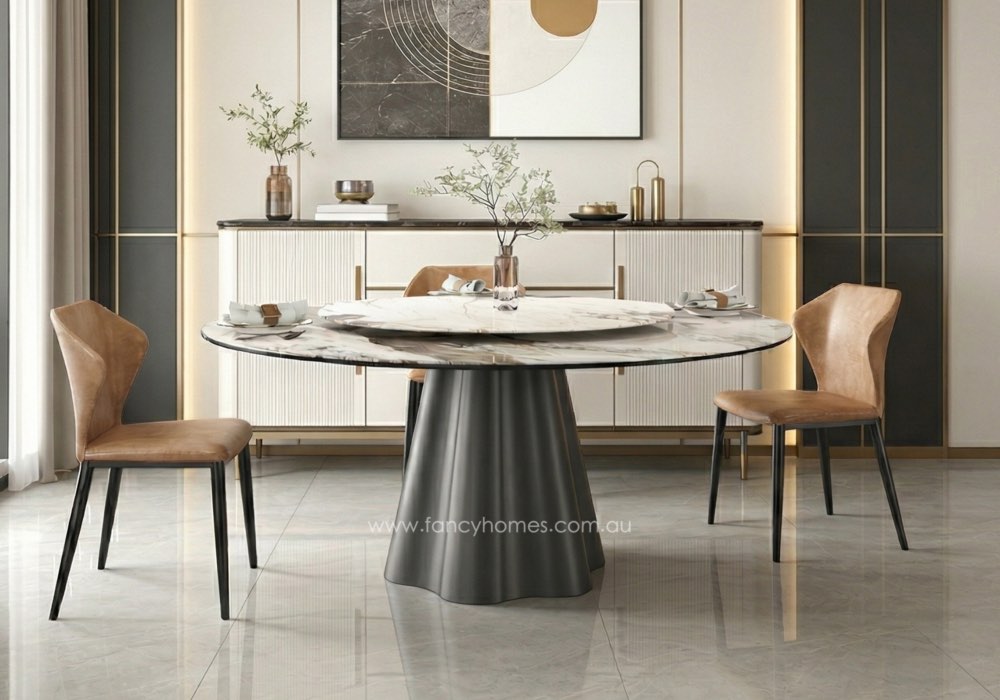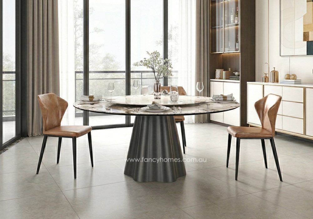 The Kove Sintered Stone Round Dining Table is a masterpiece of contemporary design, blending architectural intrigue with everyday functionality. Featuring a distinctive fluted, dark grey stainless steel base and a luxurious sintered stone top, this table serves as a sophisticated focal point for the modern Australian home. Engineered for versatility, the Kove seamlessly transitions from intimate family dinners to grand social gatherings, offering a perfect balance of durability and high-end aesthetic.