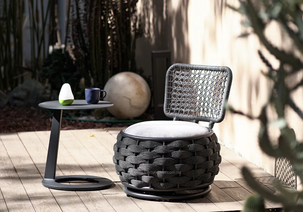 Constructed from 100% heavy-duty aluminum, it features a substantial 4mm thick tabletop and a low-profile flat ring base that provides exceptional stability without adding visual bulk. Finished with a premium high-temperature sand-textured powder coating, the N2372 is completely rust-proof and highly resistant to the harsh Australian sun. Available in Carbon Grey, Champagne, and Sand White, it is a sleek, space-saving addition to any patio or poolside deck.