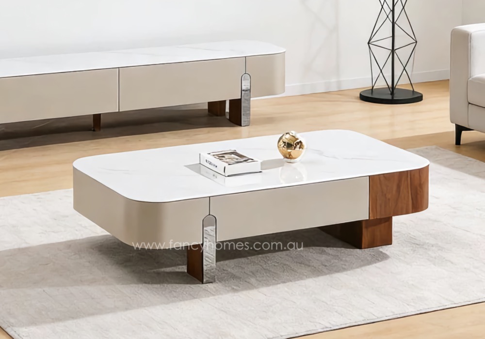 The Orlina coffee table balances soft curves with clean geometry. It features marble top paired with warm walnut veneer accents. The rounded form softens the space, while integrated drawers offer practical storage without compromising its streamlined look.Product Details