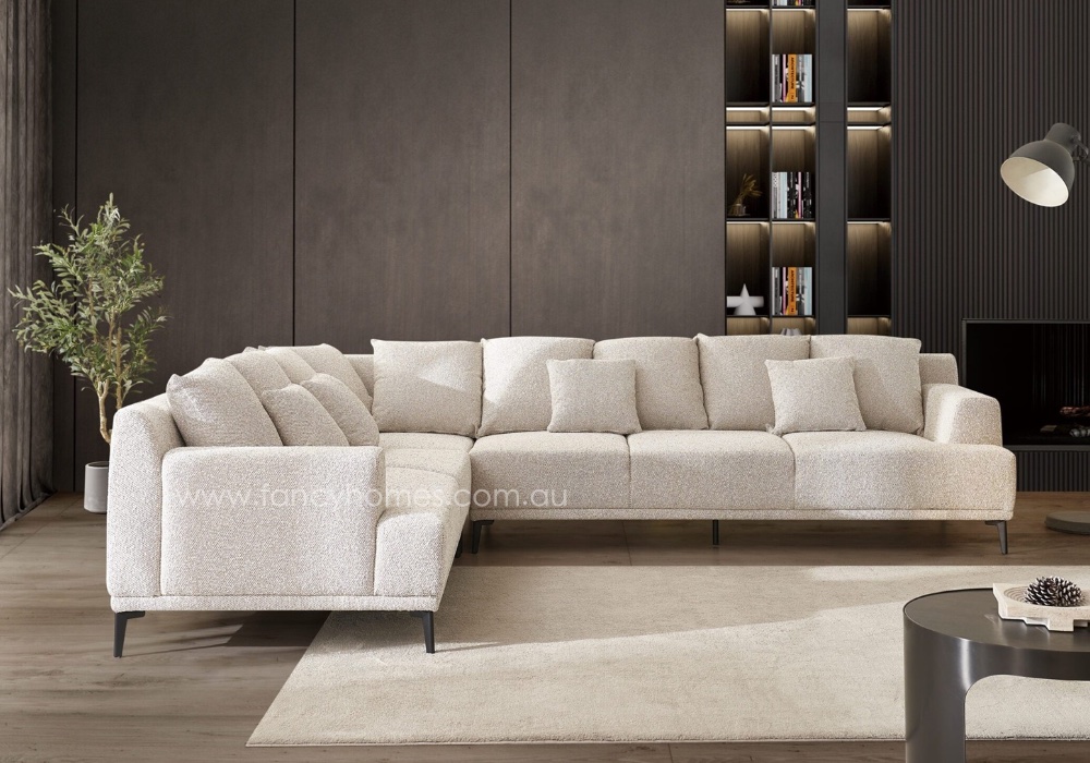Bring a touch of refined, contemporary elegance to your home with the Renova Corner Fabric Lounge. Designed for modern living and effortless entertaining, this expansive L-shaped suite maximizes your seating without compromising on style. Defined by its crisp, clean lines and a beautifully tailored silhouette, the Renova offers a timeless minimalist aesthetic. The design is elevated by sleek black metal legs, creating a sophisticated “floating” effect that enhances the sense of space and light in your living room. Wrapped in your choice of premium upholstery—choose between the soft, luminous glow of Chenille or the highly sought-after, tactile richness of Looped Boucle—the Renova delivers an inviting and bespoke lounging experience. Engineered with high-density foam for supportive, enduring comfort and built upon a solid hardwood frame, this suite perfectly balances chic, airy design with the rigorous demands of everyday family life.Configuration options