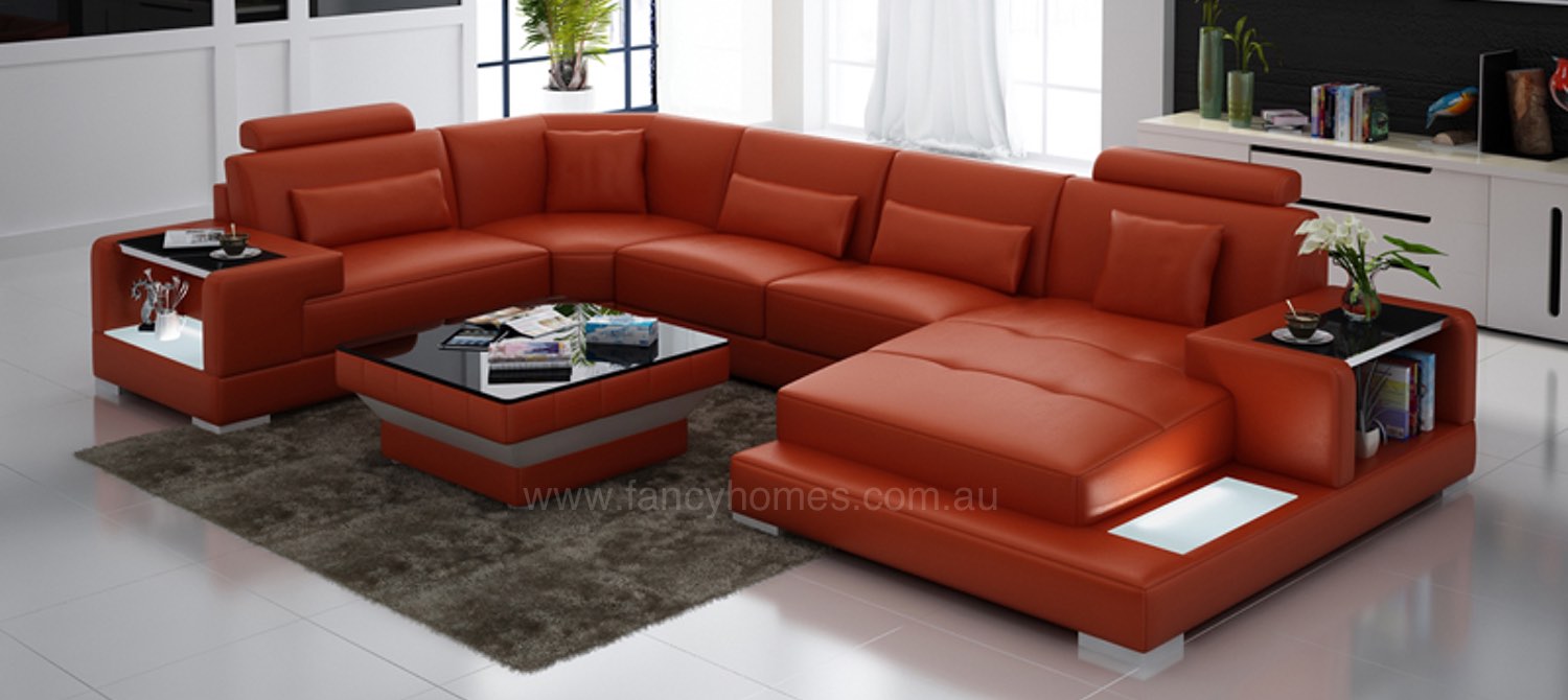 The Verena U-shaped modular leather sofa is our new design featuring integrated LED lighting systems.Wrapped with beautiful and soft leather, the super-resilient high-density foam in the seating and back areas maintains the shape of this lounge while providing maximum comfort and support. The unique armrests design provides coffee table functions and storage space for your lounge room accessories. The streamlined yet sophisticated design together with extra wide chaise is making the Verena modular leather lounge a unique addition to your living area. To view more configurations of this design, please click here.The standard verena modular leather sofa includes: